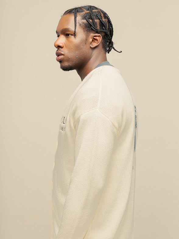 Elevate your wardrobe with the men's long-sleeve cardigan kntwear in ecru, designed for both style and comfort. A custom fit that offers both comfort and a sharp appearance.